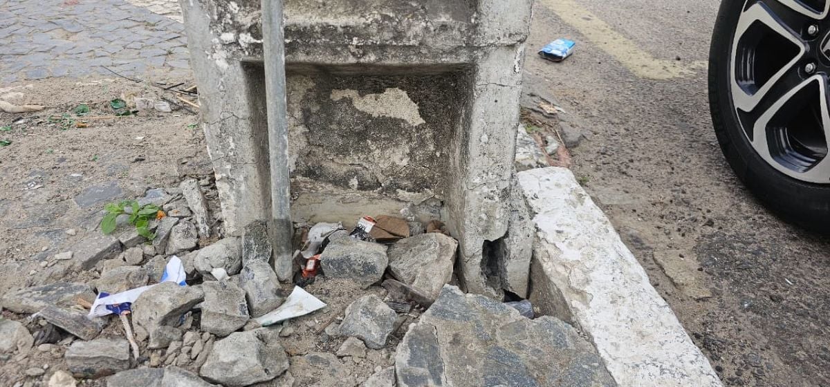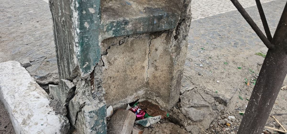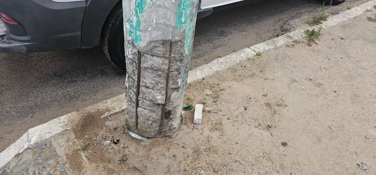 Cal fez questão de sinalizar que os postes estão em péssimo estado de conservação, apresentando deformações estruturais na base, justamente em um ponto crucial para manter os componentes de pé. Em alguns pontos é possível ver as ferragens que ficam na parte interna dos postes. Para piorar a situação, em um deles está fixado um transformador, um dispositivo elétrico que pesa cerca de 300 kg.