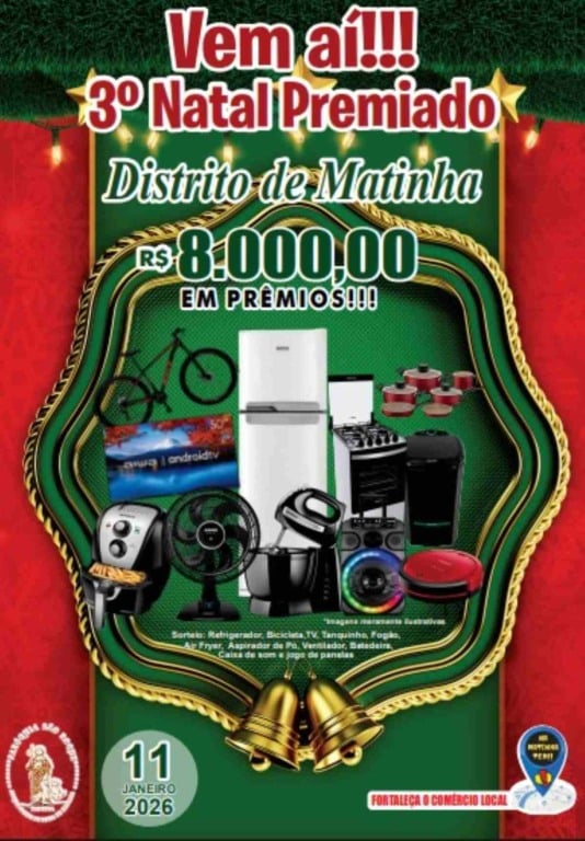 O grande sorteio está marcado para o dia 11 de janeiro de 2026, com prêmios que somam R$ 8.000,00. Entre os brindes estão eletrodomésticos, bicicleta, televisão, liquidificador, forno elétrico, e outros itens que prometem animar os consumidores.