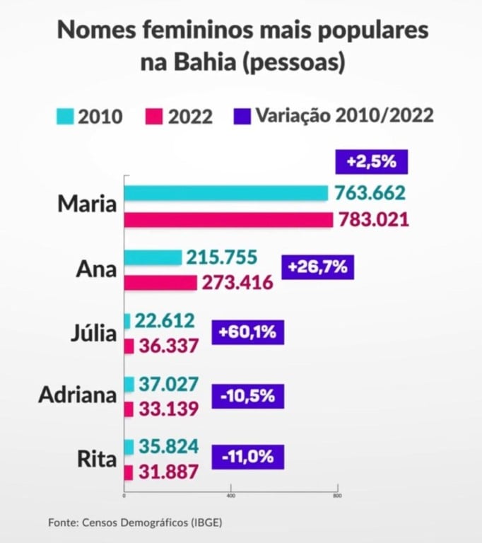 A principal mudança no ranking feminino foi a ascensão de Júlia. O nome subiu da 28ª posição em 2010 para o 3º lugar em 2022. O aumento foi de 60,1%, passando de 22.612 para 36.337 mulheres com esse nome no estado.