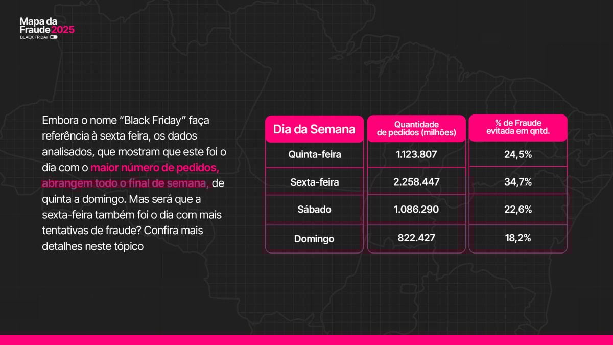 O PIX foi o meio de pagamento utilizado para finalizar mais de 570 mil pedidos, gerando um volume de R$ 184 milhões. Por outro lado, as operações via PIX ainda não passam pelos mesmos filtros antifraude aplicados a cartões de crédito, o que cria novas lacunas de segurança e demanda integração entre bancos, varejistas e fintechs.