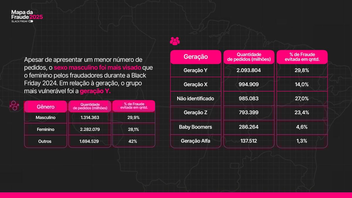 Durante a Black Friday de 2024 (entre os dias 28 de novembro e 1º de dezembro), os consumidores da Geração Y lideraram o volume de compras online, com mais de 2 milhões de transações. Os Millenials também foram o principal alvo das tentativas de fraude, concentrando quase 30% dos ataques. Em um recorte de gênero, embora as mulheres tenham realizado mais compras no período, a taxa de tentativas de fraude foi mais elevada entre os homens. Os dados são da Serasa Experian, primeira e maior datatech do Brasil, líder em identidade digital e prevenção a fraudes.