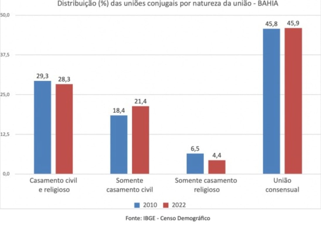 - Casamento civil e religioso na Bahia (2022): 28,3% (redução em relação a 2010);