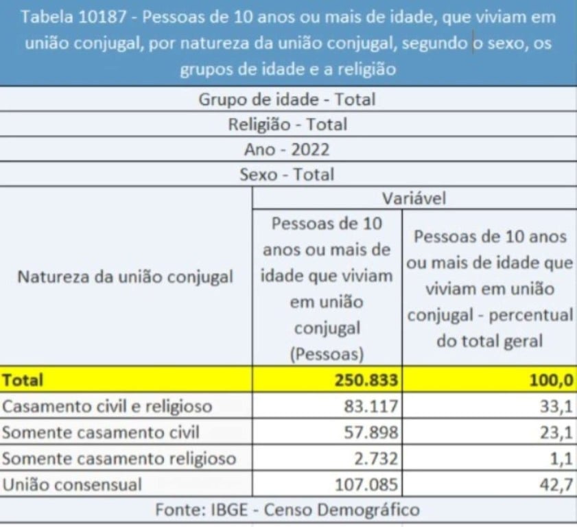 Em Feira de Santana, quase metade das pessoas que vivem em união conjugal estão em união consensual, ou seja, não oficializaram a relação no papel, seja no casamento civil ou religioso. É o que mostram os dados do Censo Demográfico 2022, obtidos pelo Acorda Cidade através do Instituto Brasileiro de Geografia e Estatística (IBGE).
