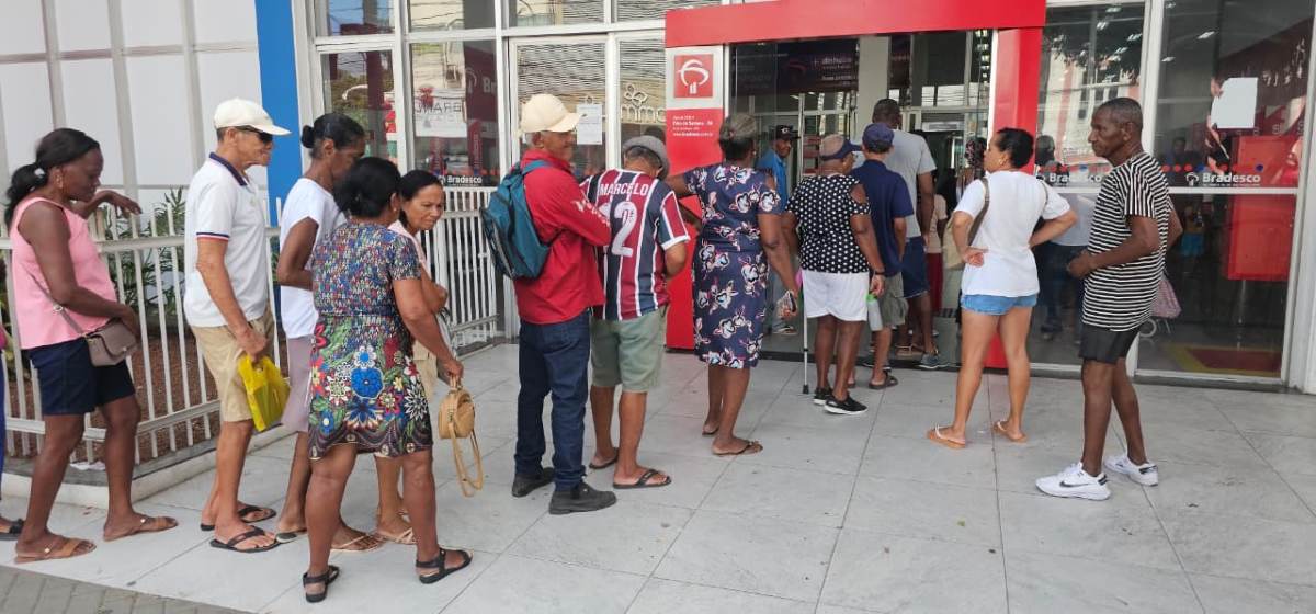 Uma das mulheres presentes é de Coração de Maria e vai mensalmente sacar o pagamento do pai, Hildo Figueiredo, de 98 anos.