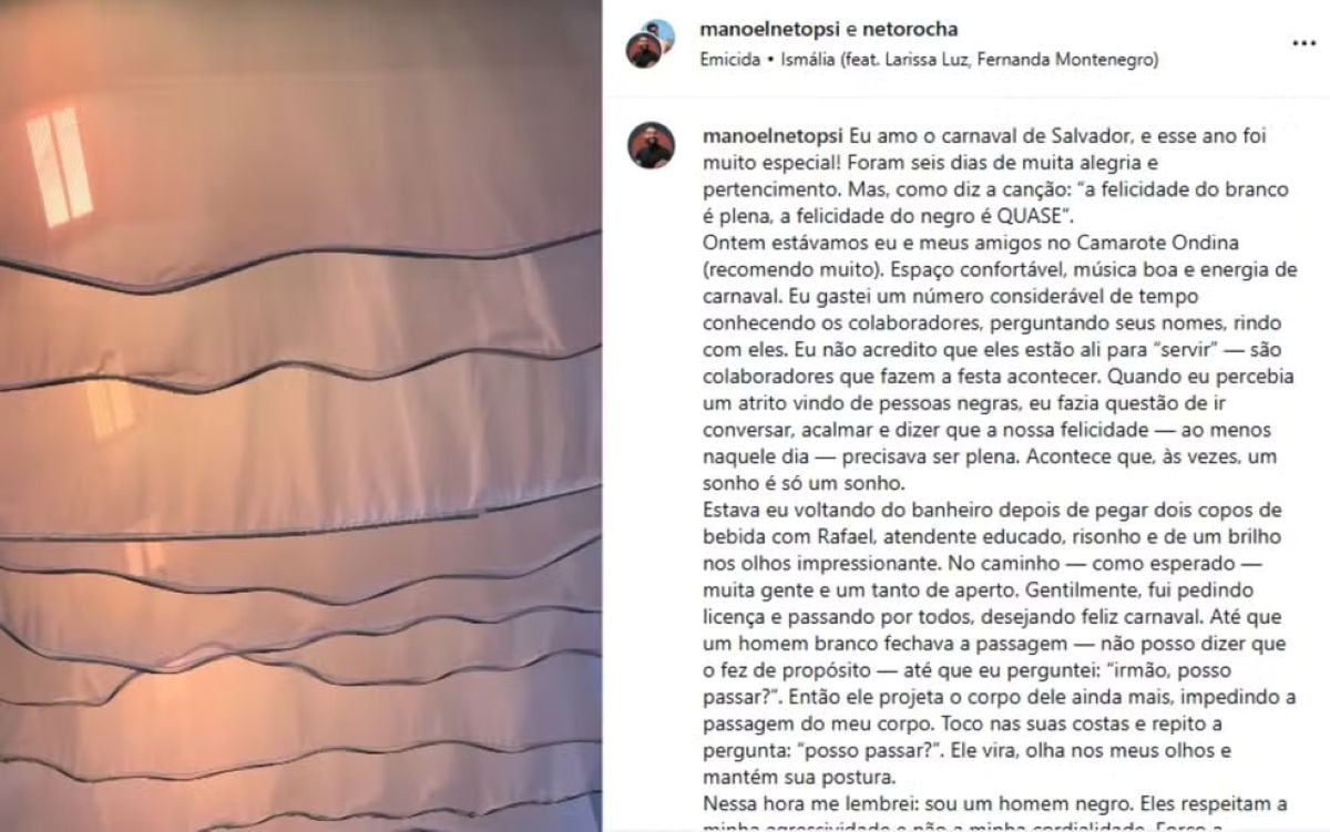 Em um relato publicado nas redes sociais na terça-feira (17), Manoel, que havia sido aprovado há menos de um mês no mestrado da Universidade Federal da Bahia (Ufba), desabafou sobre a situação vivida no espaço. Segundo ele, um homem branco teria impedido sua passagem em um ponto do camarote, o que gerou uma discussão.