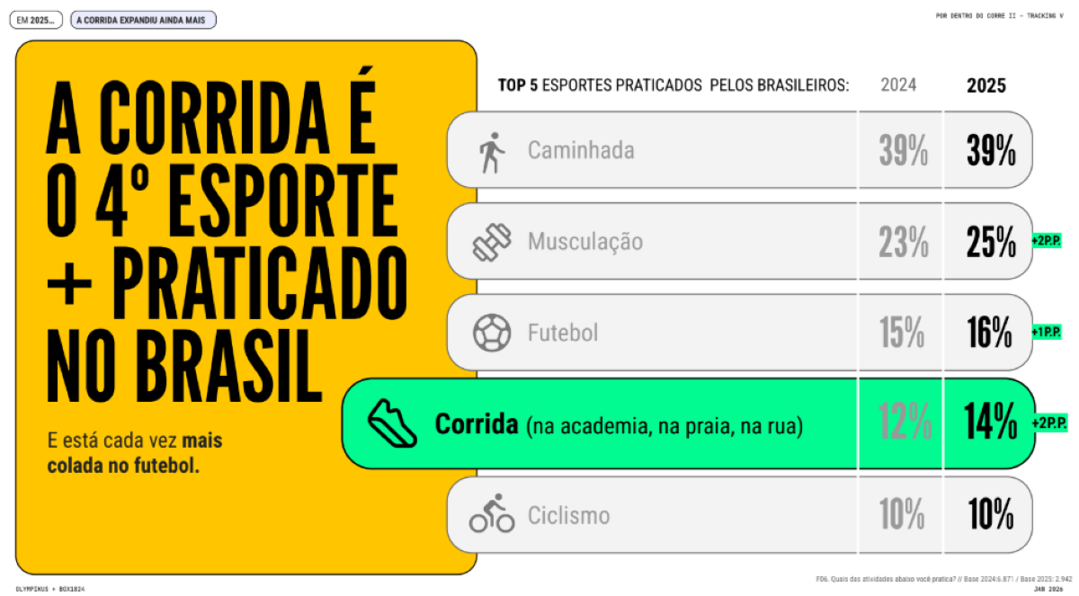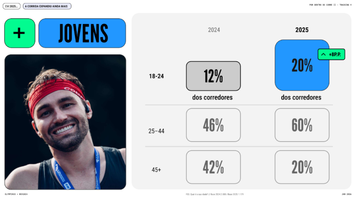 O levantamento também mostra o perfil do corredor, que vem mudando. Mulheres, jovens e pessoas da classe C foram os principais responsáveis pela renovação da base de corredores no último ano. As mulheres lideram a entrada de novos praticantes: 56% começaram a correr há menos de um ano, e elas já representam metade dos corredores. O estudo, que foi solicitado pela Olympikus, também aponta um rejuvenescimento do esporte. A idade média dos corredores caiu de 37 anos, em 2024, para 34 anos, em 2025, impulsionada principalmente pelo crescimento de praticantes na faixa etária entre 18 e 24 anos, que passou de 12% para 20% do total.