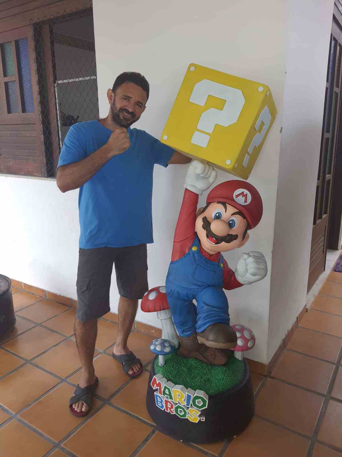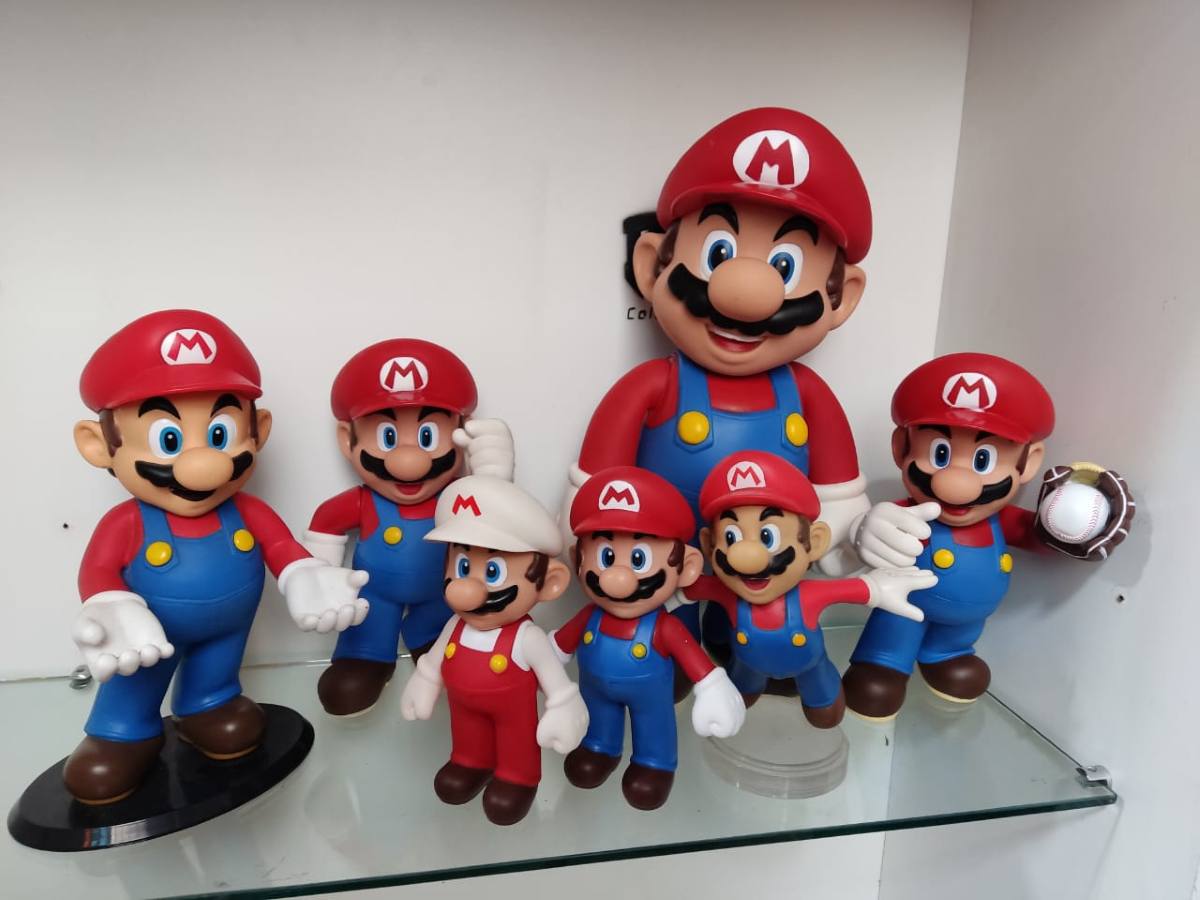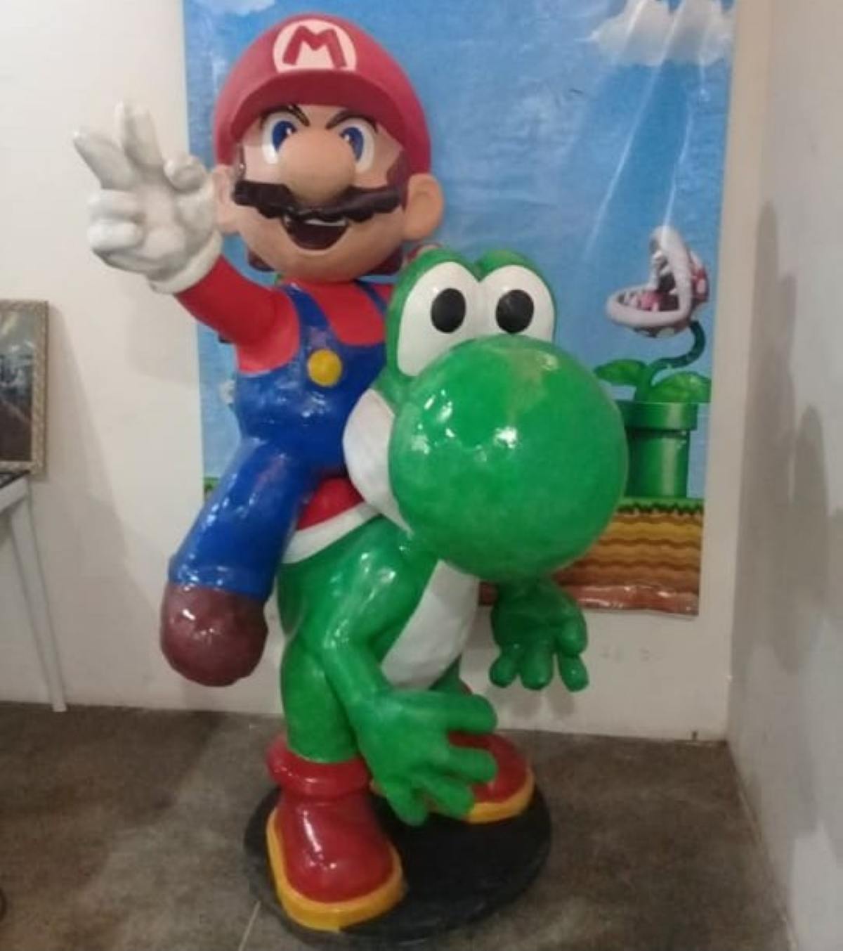 Fábio também uniu a profissão de artesão à paixão nostálgica. Ele já esculpiu à mão os personagens Mario e Yoshi em fibra de vidro e resina. O trabalho demorou dois anos para ficar pronto e tem 1,83 metros de altura.