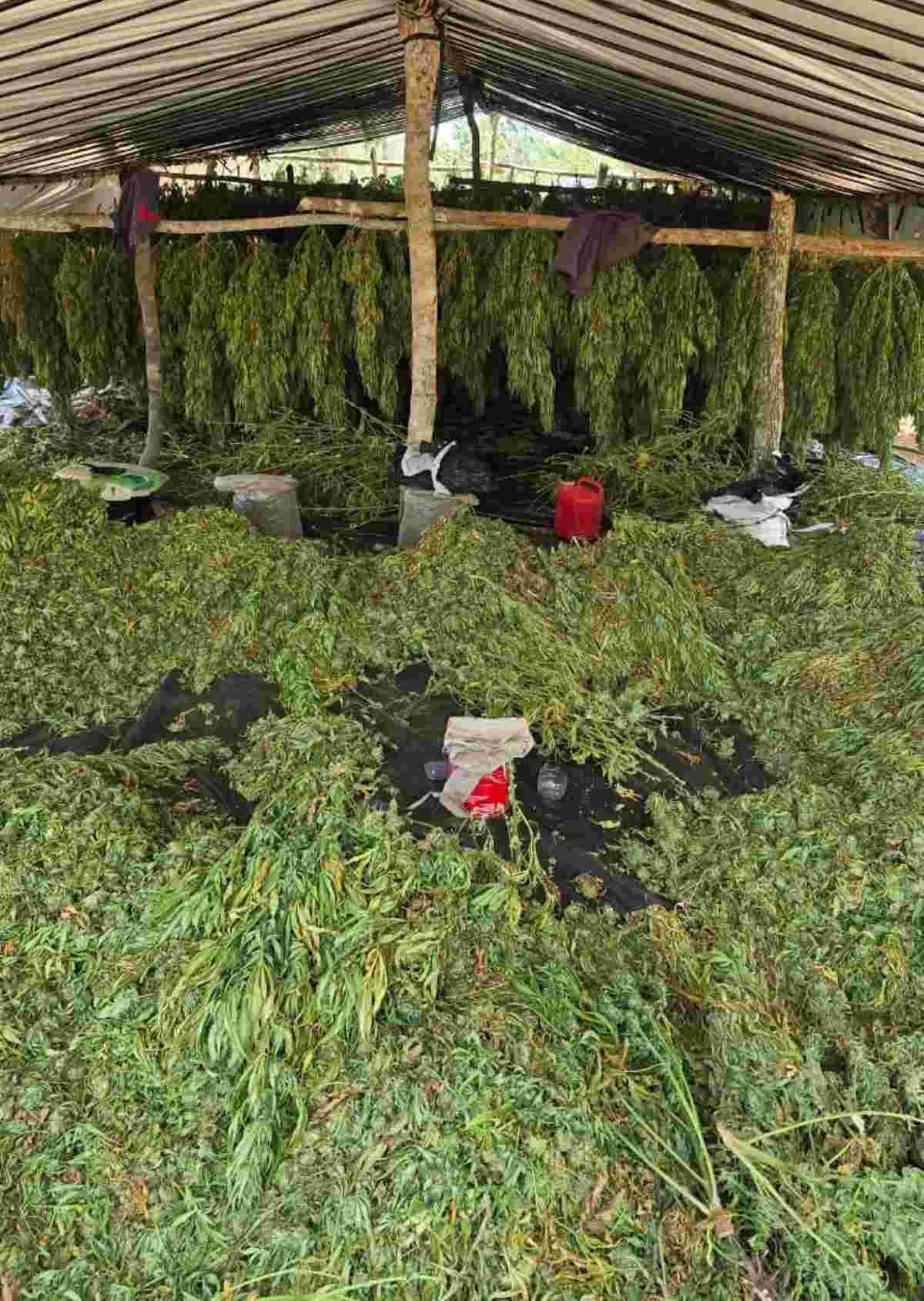 Além do plantio, também foram encontradas estruturas improvisadas contendo cerca de uma tonelada da droga já pronta para consumo.