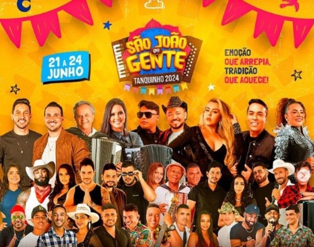 O tradicional São João da Gente, na cidade de Tanquinho, que começa na próxima sexta (21) e segue até segunda (24), promete animar o público com muita música e forró pra dançar juntinho. A banda Cavaleiros do Forró e o cantor Flávio José estão entre as atrações. Confira: