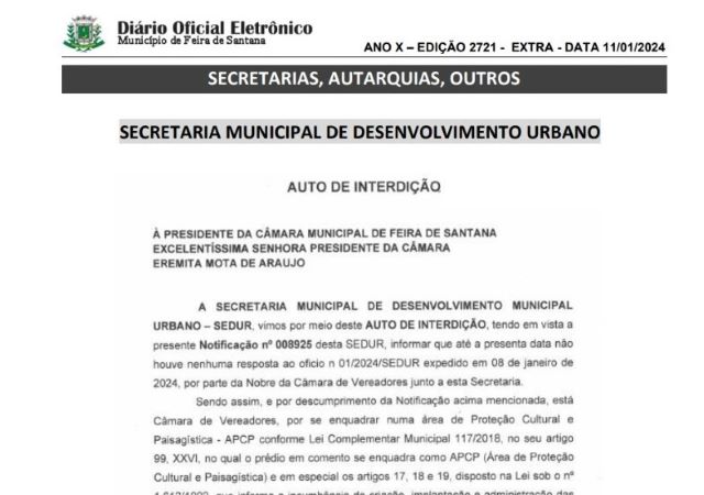 A Prefeitura de Feira de Santana, través da Secretaria de Desenvolvimento Urbano (Sedur), interditou a obra de reforma do prédio da Câmara Municipal. O imóvel se enquadra como Área de Proteção Cultural e Paisagística (APCP). Neste sentido, o prédio não pode sofrer nenhuma interferência sem a autorização do Poder Executivo.