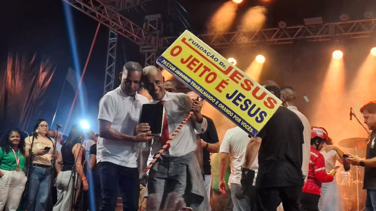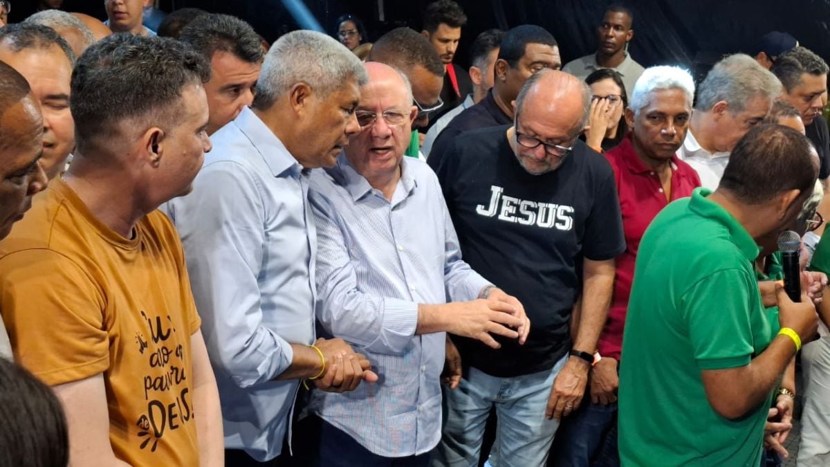 Em um palco montado na Avenida Getúlio Vargas, o governador Jerônimo Rodrigues (PT), o prefeito José Ronaldo de Carvalho (União Brasil) e o deputado federal Zé Neto (PT) participaram de um momento de oração ajoelhados, sinalizando alinhamento em torno de pautas para o município.